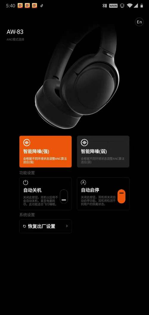 更多的功能,我们还可以通过惠威HiVi设计的HiVi Connect APP链接耳机实现,在APP内用户可以对耳机的工作模式一些简单的设计,比智能降噪有2个档位一个是强、一个是弱,另外还有自动启停功能开启或者关闭,默认情况下,自动开关机是开启的状态,就是当长时间耳机没有连接到设备的话,将会自动关机以节省电量。