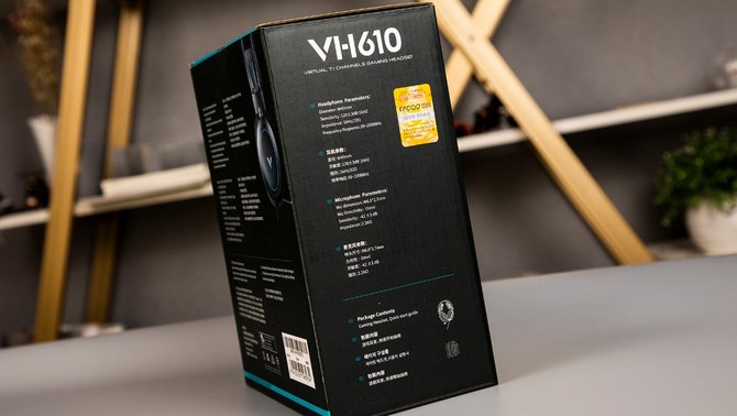 首先是外包装,作为一款针对电竞玩家设计的耳机,耳机的包装当然要非常的酷炫了,VH610整个外观采用了深黑色的配色,包装的正面绘制了耳机的渲染图,看上十分大气。