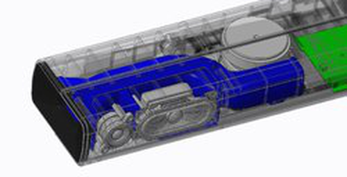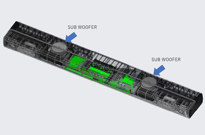 采用纤薄的一体式机身,配有2个25mm高音、2个45mm×90mm椭圆形中音和2个75mm低音,共计内置6个扬声器。低音炮单元向下安装,声音不易壅塞,可实现逼真的音效。侧面和背面设有低音导向孔