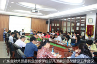 为迎接国家示范校建设省级验收,全力推进示范校建设工作,2014年3月31日下午2:30,广东省对外贸易职业技术学校在实训楼三楼大会议室组织召开了国家示范校建设及验收指标解读会。会议由刘从兵校长主持,广东省对外贸易职业技术学校示范办各小组成员及三级以上项目负责人参加了会议,同时会议邀请了国家示范校项目建设专家指导小组成员、校内实习基地家商城总经理冷亚伟和家商城公司市场总监何东生参加。