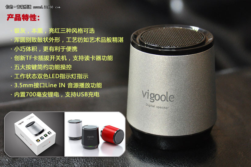 产品特性,银灰,本黑,亮红三种风格可选,浑圆别致鼓状外形,工艺彷如艺术品般精湛, 小巧体积,更有利于便携, 创新TF卡插拔开关机,支持读卡器功能,五大按键简约功能操控,工作状态双色LED指示灯指示, 3.5mm接口Line IN 音源播放功能
